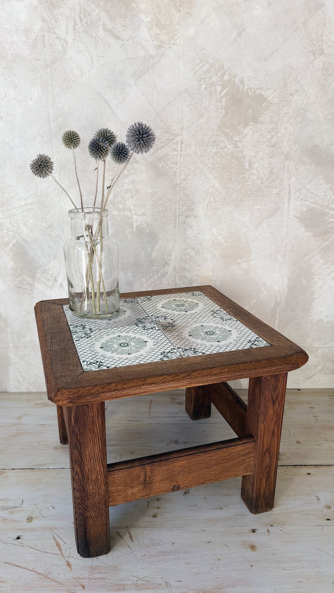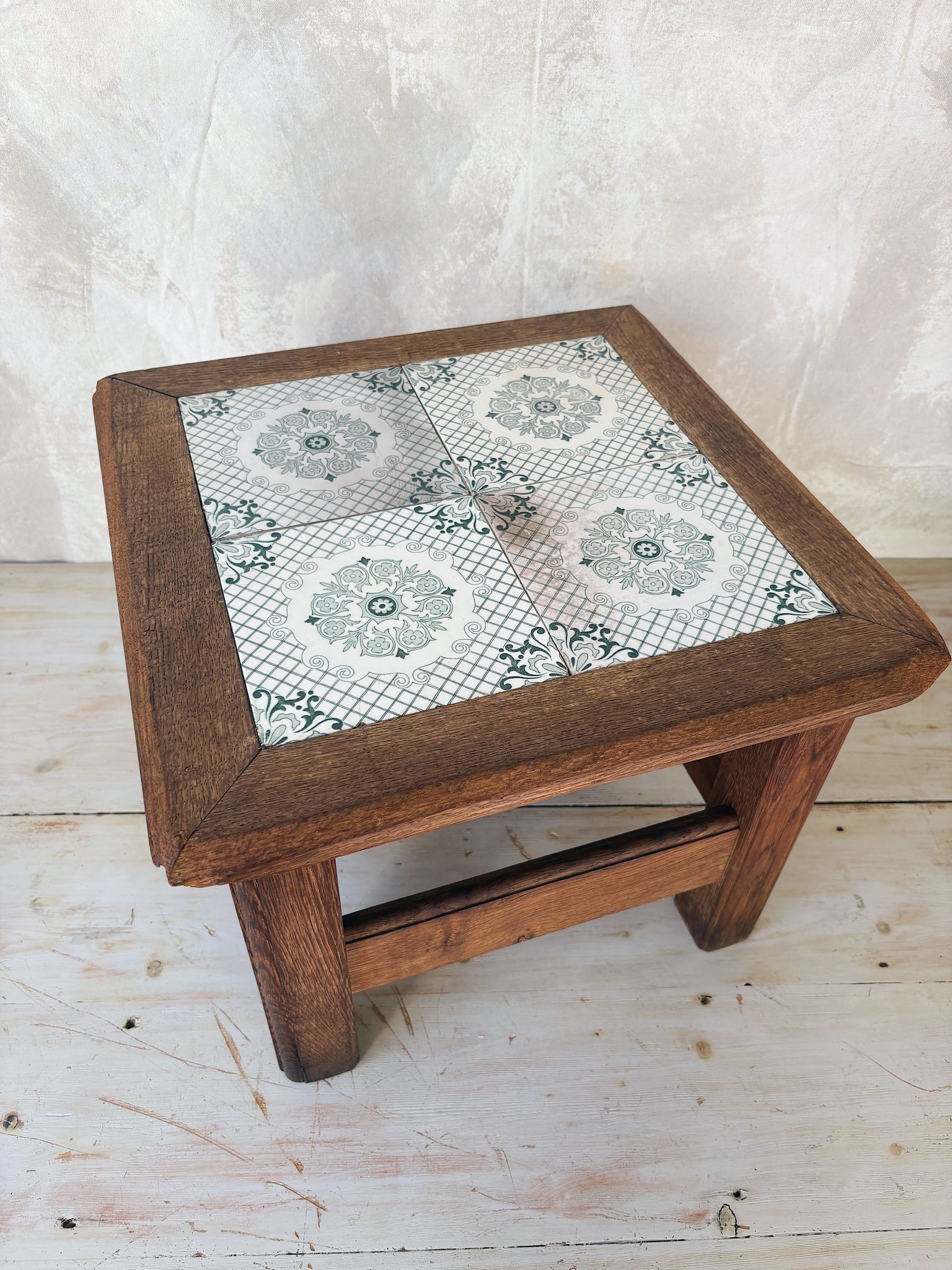 The antique tiles are in a turquoise/teal green Art deco pattern. There is some black shadowing on the tiles probably from a flame held too close.