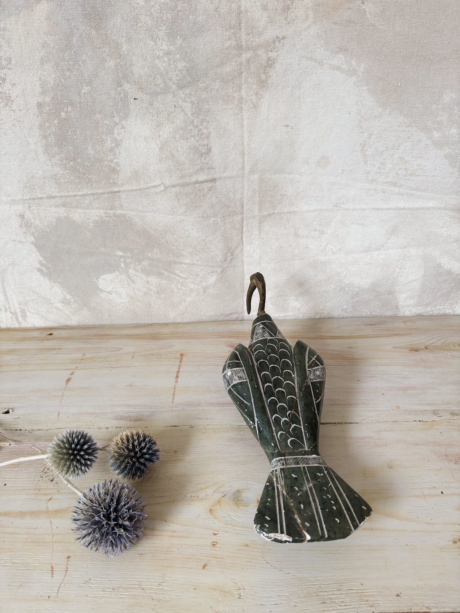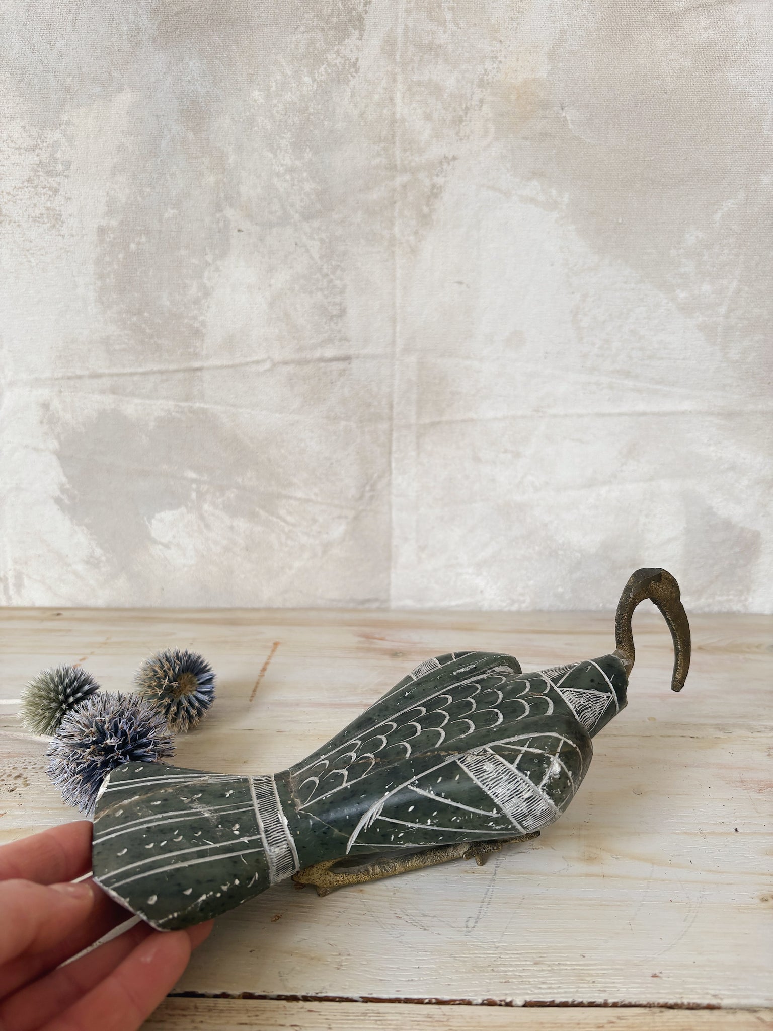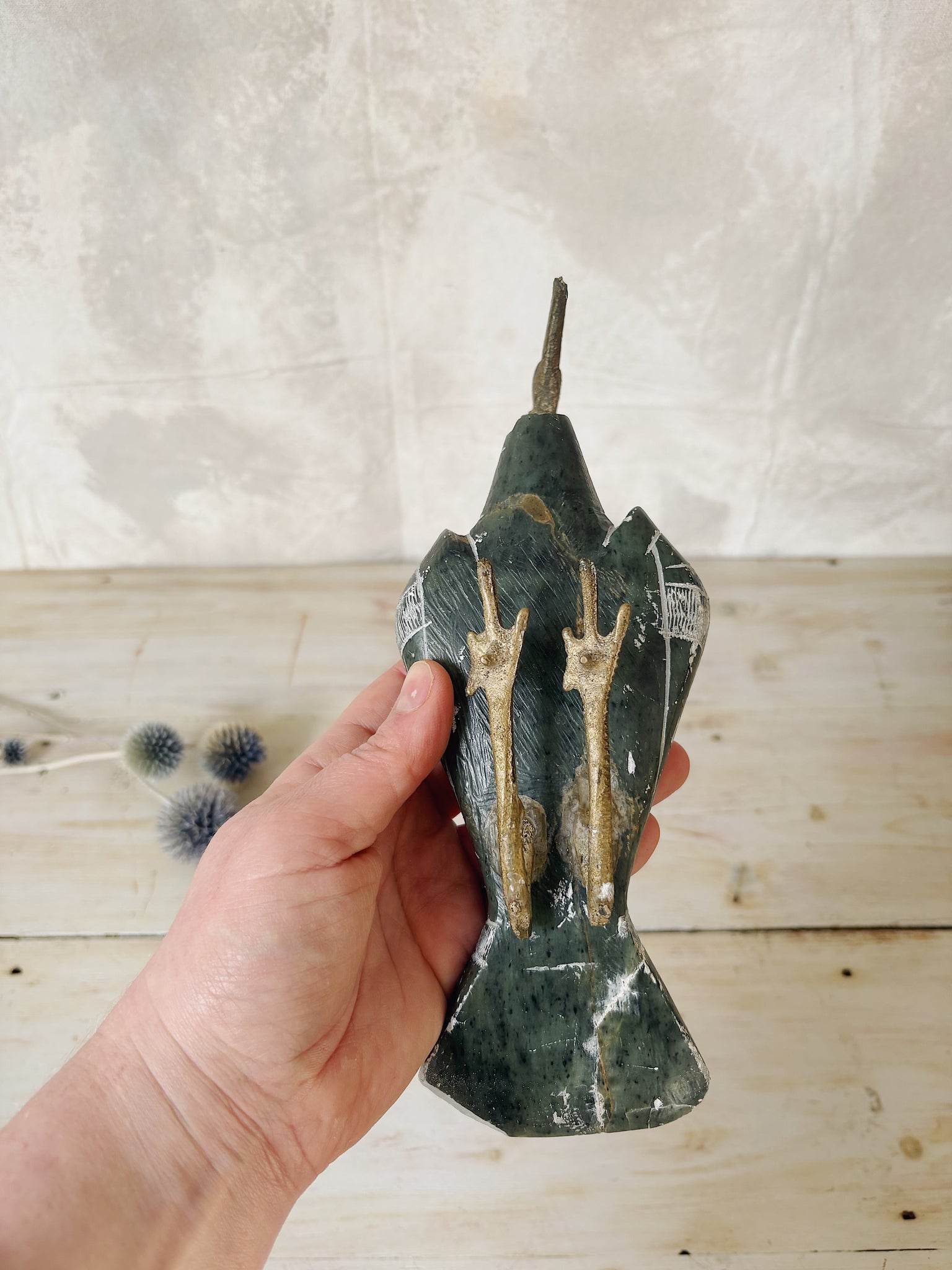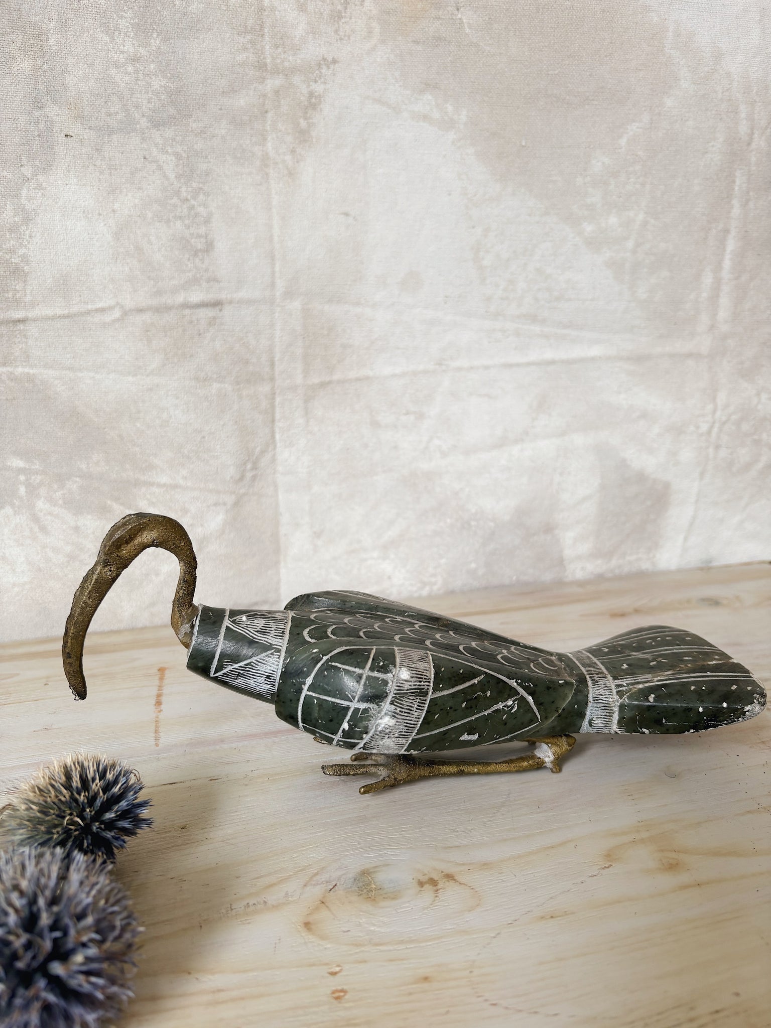 A vintage bird figurine crafted from marbled green soapstone with a brass head and feet.