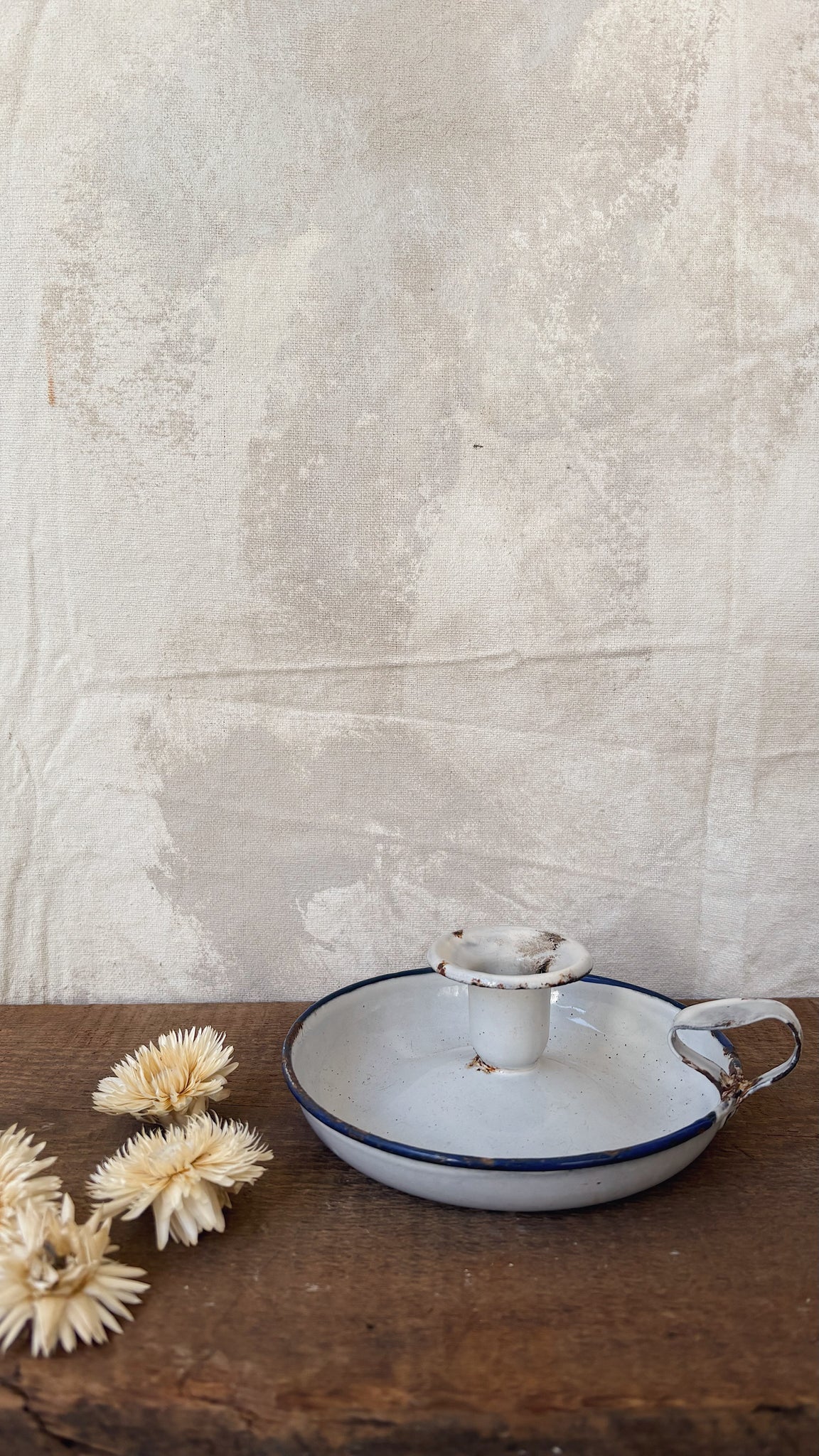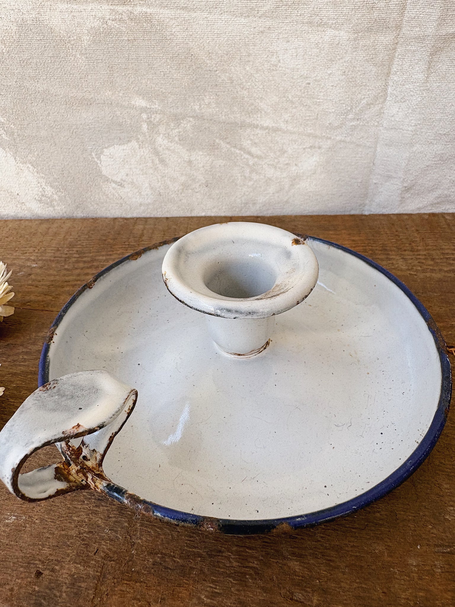 Vintage French enamel chamberstick candle holder in white with a blue rim