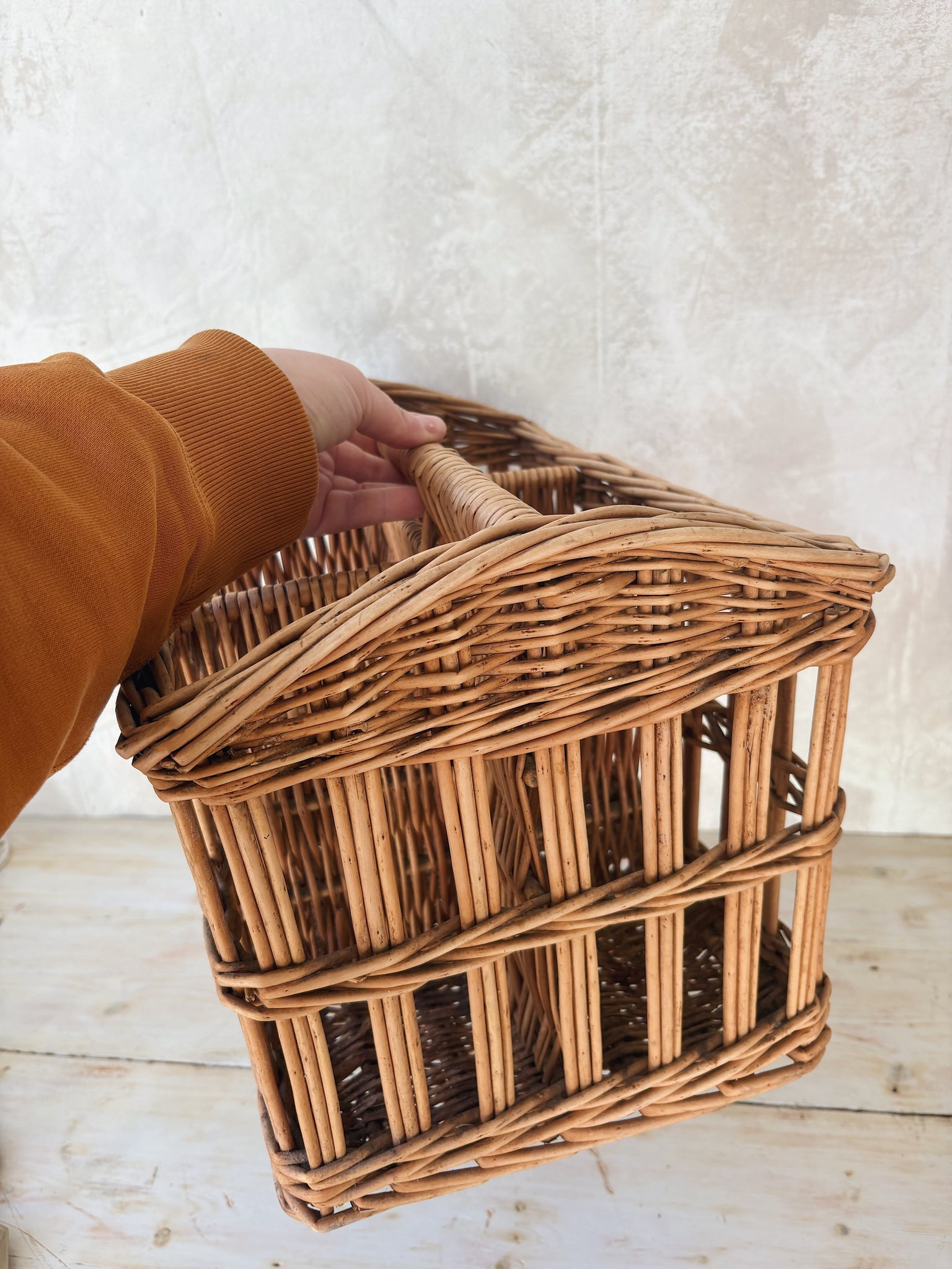 A lovely honey coloured basket with a handle